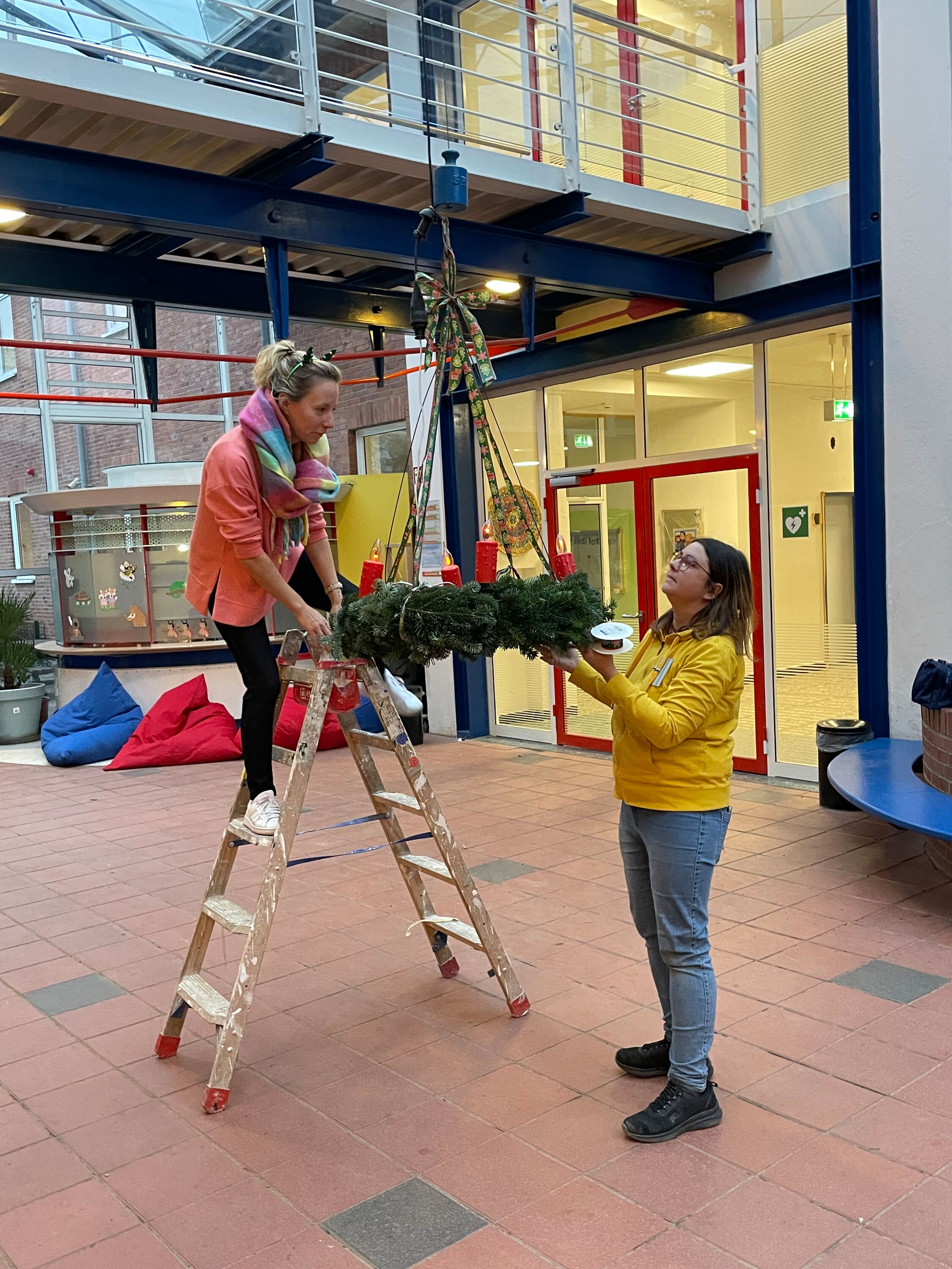 Auch in diesem Jahr hat sich die Klaus-Groth-Schule weihnachtlich festlich herausgeputzt. In allen Räumen wurde fleißig gebastelt und gewerkelt, Fenster geschmückt, Sterne aufgefädelt und Adventsstimmung verbreitet. Nun leuchtet in der Pausenhalle wieder der liebevoll geschmückte Weihnachtsbaum und am Adventskranz brannte bereits die erste Kerze. Hier treffen wir uns nun an jedem Montag zum gemeinsamen Weihnachtssingen - und jedes Mal rückt das Fest ein kleines Stückchen näher!