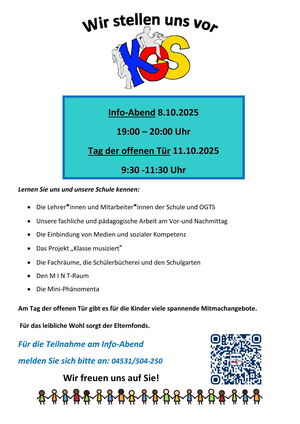 Wenn Ihr Kind bis zum 30. Juni 2025 sechs Jahre alt wird, ist es im nächsten Jahr schulpflichtig. An unserem Tag der offenen Tür können Sie und Ihr zukünftiges Schulkind die Klaus-Groth-Schule schon einmal näher kennenlernen. Die Schulfächer Mathematik, Deutsch, Sachunterricht, Sport, Kunst und Musik halten viele Mitmachangebote bereit. Auch die Räume der Betreuung sind geöffnet. Der Info-Abend ist für die Erwachsenen interessant.
